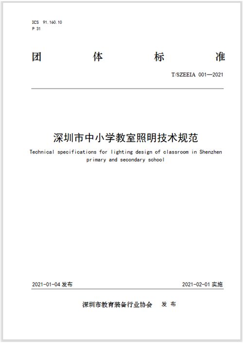 1月4日,深圳市教育裝備行業(yè)協(xié)會(huì)發(fā)布公告宣布《深圳市中小學(xué)教室照明技術(shù)規(guī)范》(T/SZEEIA 001——2021)團(tuán)體標(biāo)準(zhǔn)正式發(fā)布,將于2020年2月1日起實(shí)施。