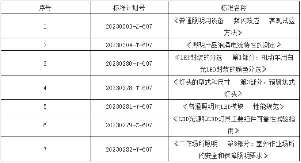 2023年3月21日,國家標(biāo)準(zhǔn)化管理委員會下達(dá)2023年第一批推薦性國家標(biāo)準(zhǔn)計(jì)劃及相關(guān)標(biāo)準(zhǔn)外文版計(jì)劃(國標(biāo)委發(fā)【2023】10號),其中包括全國照明電器標(biāo)準(zhǔn)化技術(shù)委員會歸口的7項(xiàng)照明領(lǐng)域國家標(biāo)準(zhǔn)項(xiàng)目。