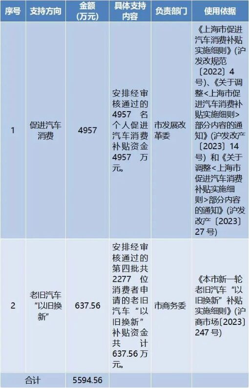 2、按照《本市新一輪老舊汽車“以舊換新”補貼實施細則》(滬商市場〔2023〕247號)規(guī)定,安排經(jīng)審核通過的第四批共2277位消費者申請的老舊汽車“以舊換新”補貼資金共計637.56萬元。