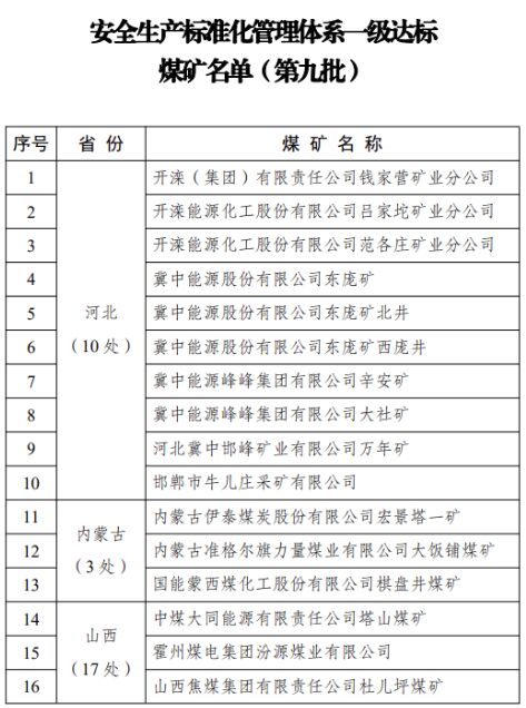附件:安全生產(chǎn)標(biāo)準(zhǔn)化管理體系一級(jí)達(dá)標(biāo)煤礦名單(第九批)
