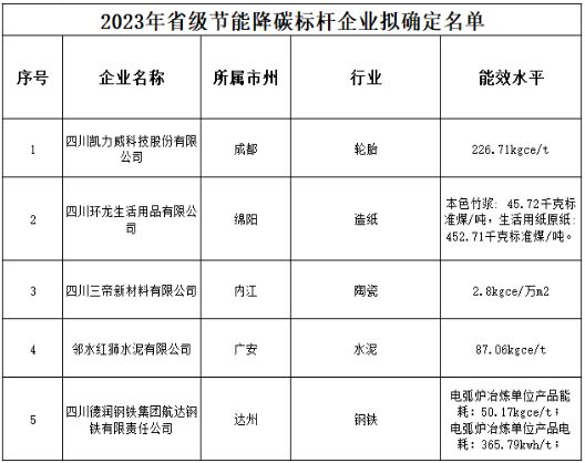 按照《四川省經(jīng)濟和信息化廳 四川省發(fā)展和改革委員會 四川省市場監(jiān)督管理局關(guān)于組織開展2023年重點行業(yè)國家能效“領(lǐng)跑者”企業(yè)及省級節(jié)能降碳標(biāo)桿企業(yè)遴選工作的通知》(川經(jīng)信環(huán)資函〔2023〕873號)要求,經(jīng)企業(yè)申報、市州初審、專家評審等程序,擬將四川凱力威科技股份有限公司等5家企業(yè)確定為2023年省級節(jié)能降碳標(biāo)桿企業(yè)。現(xiàn)將2023年省級節(jié)能降碳標(biāo)桿企業(yè)擬確定名單予以公示。