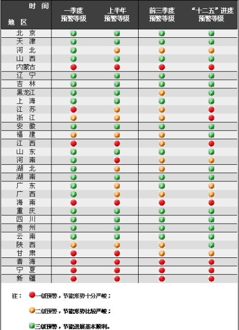 為督促各地做好節(jié)能工作,我們建立模型對(duì)各地區(qū)前三季度單位GDP能耗變化情況進(jìn)行了預(yù)測(cè),并與各地區(qū)年度及“十二五”節(jié)能目標(biāo)任務(wù)進(jìn)行了比較分析,確定了各地預(yù)警等級(jí),制作了各地區(qū)節(jié)能目標(biāo)完成情況晴雨表。 通過分析,內(nèi)蒙古、海南、青海、寧夏、新疆等5地區(qū)預(yù)警等級(jí)為一級(jí),河北、黑龍江、江蘇、浙江、福建、江西、河南、湖北、廣西、陜西、甘肅等11個(gè)地區(qū)預(yù)警等級(jí)為二級(jí),北京、天津、山西、遼寧、吉林、上海、安徽、山東、湖南、廣東、重慶、四川、貴州、云南等14個(gè)地區(qū)預(yù)警等級(jí)為三級(jí)。西藏缺乏統(tǒng)計(jì)數(shù)據(jù),沒有進(jìn)行預(yù)測(cè)。與上半年預(yù)測(cè)相比,有1個(gè)地區(qū)預(yù)警等級(jí)提高,黑龍江由三級(jí)預(yù)警轉(zhuǎn)為二級(jí)預(yù)警,節(jié)能形勢(shì)趨于嚴(yán)峻;有4個(gè)地區(qū)預(yù)警等級(jí)下降,江西、河南、甘肅由一級(jí)預(yù)警轉(zhuǎn)為二級(jí)預(yù)警,廣東由二級(jí)預(yù)警轉(zhuǎn)為三級(jí)預(yù)警。 與“十二五”節(jié)能工作進(jìn)度要求相比較,內(nèi)蒙古、江蘇、浙江、江西、海南、青海、寧夏、新疆等地區(qū)預(yù)警等級(jí)為一級(jí),河北、河南、廣東、廣西、甘肅等地區(qū)預(yù)警等級(jí)為二級(jí),北京、天津、山西、遼寧、吉林、黑龍江、上海、安徽、福建、山東、湖北、湖南、重慶、四川、貴州、云南、陜西等地區(qū)預(yù)警等級(jí)為三級(jí);與上半年預(yù)測(cè)相比,5個(gè)地區(qū)預(yù)警等級(jí)下降,福建、湖北、陜西由二級(jí)預(yù)警轉(zhuǎn)為三級(jí)預(yù)警,河南、甘肅由一級(jí)預(yù)警轉(zhuǎn)為二級(jí)預(yù)警。 現(xiàn)將晴雨表印發(fā),供各地區(qū)在工作中參考。 各地區(qū)2011年前三季度節(jié)能目標(biāo)完成情況晴雨表