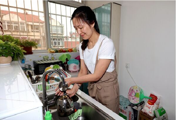 圖為被采訪居民用南水北調(diào)來(lái)的自來(lái)水為記者們燒水泡茶