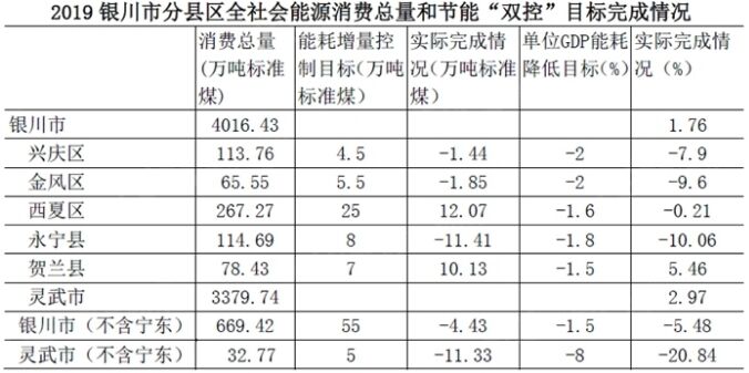 按照自治區(qū)年度考核5+1模式(寧東能耗等分項指標(biāo)單列),扣除寧東,銀川市全社會能源消費(fèi)量669.42萬噸標(biāo)準(zhǔn)煤,同比下降0.66%,單位GDP能耗同比下降5.48%,年度消費(fèi)量增量為減少4.43萬噸標(biāo)準(zhǔn)煤,超額完成了2019年銀川市(扣除寧東)單位GDP能耗下降1.5%,能源消費(fèi)增量控制在55萬噸標(biāo)準(zhǔn)煤以內(nèi)的節(jié)能“雙控”目標(biāo)任務(wù)。 從分縣區(qū)2019年節(jié)能“雙控”目標(biāo)的完成情況看,賀蘭縣增量控制目標(biāo)和單位GDP能耗下降目標(biāo)均未完成,西夏區(qū)完成了增量控制目標(biāo),但未完成單位GDP能耗的下降目標(biāo),其它縣(市)區(qū)均較好的完成當(dāng)年的節(jié)能“雙控”目標(biāo)。