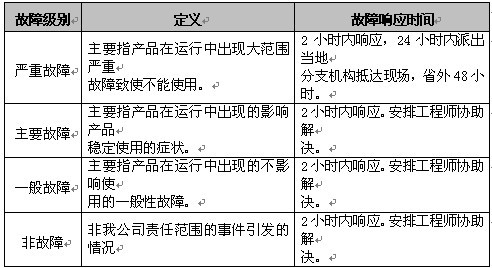 三、大明燈業(yè)的售后服務(wù)體系 1.直屬服務(wù)機(jī)構(gòu) 強(qiáng)大的技術(shù)力量和用戶(hù)支持隊(duì)伍正是大明燈業(yè)取得成功的優(yōu)勢(shì)所在。而大明燈業(yè)完善的服務(wù)支持體系是確保用戶(hù)照明系統(tǒng)順利實(shí)施和運(yùn)行的可靠保障。大明燈業(yè)的技術(shù)支持與售后服務(wù)體系是由銷(xiāo)售部、技術(shù)部等相關(guān)部門(mén)以及一整套嚴(yán)格定義的流程和制度構(gòu)成的。 我們公司為客戶(hù)提供的服務(wù)體系包括:技術(shù)咨詢(xún)、用戶(hù)培訓(xùn)、故障事件響應(yīng)、遠(yuǎn)程維護(hù)等。通過(guò)公司的管理規(guī)范有效快速為客戶(hù)提供服務(wù),具體則通過(guò)企業(yè)內(nèi)服務(wù)規(guī)范及文檔的建立,服務(wù)過(guò)程記錄,服務(wù)監(jiān)督與投訴,保障公司承諾服務(wù)的實(shí)現(xiàn)。 2.客戶(hù)服務(wù)響應(yīng)中心 作為大明燈業(yè)對(duì)外服務(wù)的窗口和客戶(hù)關(guān)系的重要環(huán)節(jié),客戶(hù)服務(wù)響應(yīng)中心將本著用戶(hù)至上、服務(wù)優(yōu)質(zhì)、響應(yīng)及時(shí)的原則為我公司的用戶(hù)提供高效可靠的服務(wù)。在人員配備上,我公司選拔有經(jīng)驗(yàn)、有責(zé)任心的員工作為客戶(hù)服務(wù)響應(yīng)中心的服務(wù)提供者。并通過(guò)一整套嚴(yán)格的服務(wù)規(guī)范和管理?xiàng)l例保障我們所提出的服務(wù)理念能夠有效的體現(xiàn)和貫徹。 其主要職責(zé): 受理用戶(hù)服務(wù)請(qǐng)求、投訴、一般答疑。對(duì)服務(wù)請(qǐng)求、投訴按行業(yè)、事件的優(yōu)先級(jí)分類(lèi),立即與相關(guān)部門(mén)取得聯(lián)系,確定處理事件的方法并建立服務(wù)跟蹤卡,監(jiān)督、跟蹤對(duì)事件的處理過(guò)程。將處理結(jié)果文檔留存?zhèn)浒浮? 3.技術(shù)中心 技術(shù)中心是大明燈業(yè)的技術(shù)核心部門(mén),其人員是由眾多資深的認(rèn)證工程師和照明專(zhuān)家組成。具有很強(qiáng)的項(xiàng)目實(shí)施和保障能力,對(duì)產(chǎn)品應(yīng)用中出現(xiàn)的故障及潛在的問(wèn)題能夠提出有效的解決方案并予以實(shí)施。 在用戶(hù)的關(guān)鍵應(yīng)用出現(xiàn)突發(fā)問(wèn)題時(shí),可以迅速組成緊急維護(hù)小組在最短的時(shí)間解決用戶(hù)的問(wèn)題,以盡可能的方便用戶(hù),保障客戶(hù)的利益。同時(shí)根據(jù)用戶(hù)的要求,大明的工程師可以通過(guò)網(wǎng)絡(luò),對(duì)異地用戶(hù)實(shí)施遠(yuǎn)程咨詢(xún),從而使我公司的用戶(hù)享受到最快捷的維護(hù)和服務(wù)。 大明燈業(yè)技術(shù)中心主要職能定義是提供產(chǎn)品的咨詢(xún)顧問(wèn)服務(wù)以及技術(shù)支持服務(wù)和項(xiàng)目實(shí)施服務(wù)。針對(duì)企業(yè)客戶(hù)提出的具體需求,提供以下幾個(gè)方面的服務(wù): (1)以客戶(hù)經(jīng)營(yíng)管理為背景的照明技術(shù)戰(zhàn)略性方案設(shè)計(jì)。 (2)以解決客戶(hù)實(shí)際問(wèn)題為目的的解決方案設(shè)計(jì)與實(shí)施。 4.其他相關(guān)部門(mén) 大明燈業(yè)由眾多的分支部門(mén)組成,每個(gè)部門(mén)分別從事著不同的應(yīng)用領(lǐng)域。用戶(hù)的需求是多樣的,也是變化的,而大明燈業(yè)的業(yè)務(wù)深入了照明行業(yè)的相關(guān)領(lǐng)域,正是基于這樣的專(zhuān)業(yè)化的優(yōu)勢(shì),我公司可以充分利用人員和技術(shù)力量方面的資源為用戶(hù)提供全方位的服務(wù),滿(mǎn)足用戶(hù)多樣的需求。 5.遍布全國(guó)各地的服務(wù)聯(lián)盟體系 為更加及時(shí)便捷響應(yīng)外地用戶(hù)的服務(wù)需求,大明燈業(yè)通過(guò)多年來(lái)與全國(guó)各地主要公司的合作,選擇了一批具備一定服務(wù)能力、具備良好服務(wù)意識(shí)的經(jīng)銷(xiāo)商,形成了強(qiáng)大的覆蓋全國(guó)的服務(wù)聯(lián)盟體系,為大明燈業(yè)在當(dāng)?shù)氐挠脩?hù)提供便利。 四、相關(guān)細(xì)則 1.系統(tǒng)保修期(維護(hù)期)階段 在試運(yùn)行期結(jié)束并通過(guò)最終驗(yàn)收后,即進(jìn)入產(chǎn)品的保修和維護(hù)期。從這個(gè)階段開(kāi)始,系統(tǒng)正式進(jìn)入實(shí)用階段,因而這一階段將成為系統(tǒng)整個(gè)支持和維護(hù)的工作中心和重點(diǎn)。本階段的工作主要由大明燈業(yè)進(jìn)行,用戶(hù)方的技術(shù)人員協(xié)助。 售后技術(shù)服務(wù)采用兩種方式進(jìn)行。第一種支持方式是直接在用戶(hù)現(xiàn)場(chǎng)工作的工程師,F(xiàn)場(chǎng)工程師有義務(wù)直接接受用戶(hù)的意見(jiàn)、投訴,親臨問(wèn)題現(xiàn)場(chǎng)了解情況,并做出分析和判斷,但沒(méi)有權(quán)利對(duì)非其所屬的項(xiàng)目組的服務(wù)對(duì)象作出任何操作。 第二種支持方式是大明燈業(yè)專(zhuān)家組的技術(shù)支持。當(dāng)極少數(shù)的問(wèn)題未能很好解決時(shí),將利用技術(shù)支持體系,給出圓滿(mǎn)解決。 2.保修期以后 (1)在本項(xiàng)目一次性購(gòu)買(mǎi)的產(chǎn)品保修維護(hù)期過(guò)后,用戶(hù)可以根據(jù)自己具體的需求,經(jīng)過(guò)雙方協(xié)商,簽署相應(yīng)的服務(wù)協(xié)議,大明燈業(yè)將提供后續(xù)的服務(wù)與技術(shù)支持。 (2)在各規(guī)格