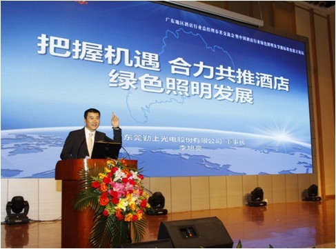2013年3月16日,由國(guó)際酒店領(lǐng)袖機(jī)構(gòu)主辦,勤上光電承辦的廣東地區(qū)酒店行業(yè)總經(jīng)理春茗交流會(huì)暨中國(guó)酒店行業(yè)綠色照明及節(jié)能標(biāo)準(zhǔn)化建立論壇在東莞召開,來自國(guó)家標(biāo)準(zhǔn)化協(xié)會(huì)專家、照明設(shè)計(jì)專家、酒店業(yè)主等120人參加。論壇上,行業(yè)協(xié)會(huì)及聯(lián)盟組織發(fā)起《中國(guó)綠色酒店照明技術(shù)規(guī)范制定》啟動(dòng)儀式,勤上光電受邀參加該規(guī)范的制定。