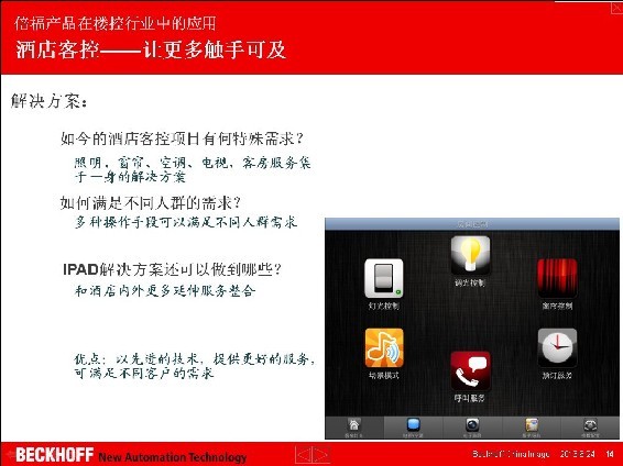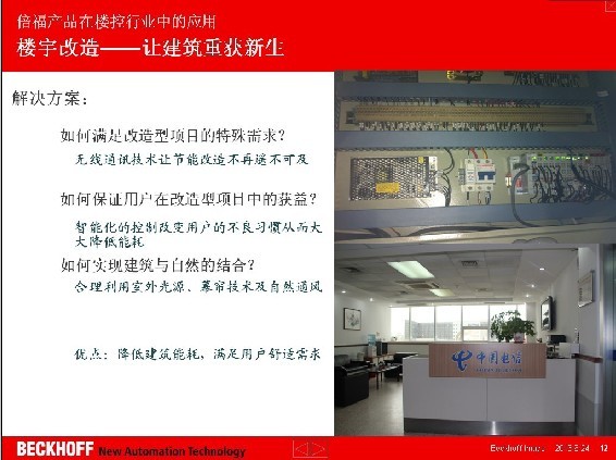 2013 年 6 月 9 日上午,由千家網(wǎng)主辦的“2013年綠色智能建筑運(yùn)維管理趨勢論壇”在廣州進(jìn)出口商品交易會(huì)展館A區(qū)6.1號(hào)館隆重舉辦,活動(dòng)邀請(qǐng)了國內(nèi)外知名企業(yè)高層與業(yè)界精英針對(duì)“綠色智能建筑運(yùn)維管理趨勢”問題進(jìn)行了深入地探討與交流,與會(huì)人員各抒己見,共話當(dāng)前綠色智能建筑運(yùn)營、維護(hù)、管理中的問題及探討未來發(fā)展趨勢。 德國倍福自動(dòng)化有限公司技術(shù)支持工程師包立應(yīng)邀出席了本次論壇,并在論壇上作了名為“倍福產(chǎn)品在樓控行業(yè)中的應(yīng)用——樓宇自動(dòng)化新技術(shù)”的主題報(bào)告。報(bào)告介紹了倍福的智能樓宇行業(yè)產(chǎn)品和解決方案在樓宇自控、樓宇改造、酒店客控、智能照明等領(lǐng)域的技術(shù)優(yōu)勢和應(yīng)用情況,向現(xiàn)場與會(huì)的嘉賓展示了Beckhoff在智能樓宇行業(yè)的發(fā)展現(xiàn)狀和未來發(fā)展趨勢。 在樓宇自動(dòng)化領(lǐng)域,倍福(Beckhoff)可全方位的設(shè)計(jì)集成式樓宇自動(dòng)化方案:家居自動(dòng)化照明、幕墻控制、操作和監(jiān)控、中央空調(diào)系統(tǒng)(HVAC)、獨(dú)立房間控制、遠(yuǎn)程維護(hù)和能源數(shù)據(jù)記錄等。由于其開放式接口是基于IT 和Windows 標(biāo)準(zhǔn)的,因此Beckhoff 基于PC和以太網(wǎng)的控制技術(shù)自然就非常適用于樓宇自動(dòng)化領(lǐng)域。此外、開放性是倍福樓宇自動(dòng)化的優(yōu)勢所在,這樣的優(yōu)勢不但體現(xiàn)在其開放式的控制架構(gòu)上,更體現(xiàn)在其集成性上。倍福所支持的通信協(xié)議豐富,EtherNet、TCP/IP、EnOcean、BacNet、RS232、RS485、LON、EIB/KNX、DALI、DMX、M-Bus,可滿足不同智能建筑的應(yīng)用需求。 本次論壇旨在促進(jìn)各方智慧碰撞,促進(jìn)行業(yè)的健康發(fā)展,加強(qiáng)各企業(yè)的交流合作,共同開發(fā)綠色智能建筑這一巨大的市場,實(shí)現(xiàn)各方共贏。智能樓宇行業(yè)生產(chǎn)企業(yè)、用戶、工程商、集成商等業(yè)界人士歡聚一堂,就業(yè)內(nèi)一些熱點(diǎn)問題進(jìn)行深度探討,并根據(jù)目前綠色建筑節(jié)能的現(xiàn)狀,剖析了綠色智能建筑在運(yùn)營、維護(hù)和管理中遇到的問題,共同展望了智能樓宇行業(yè)未來的發(fā)展遠(yuǎn)景。