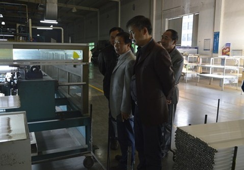 大明燈業(yè)營(yíng)銷總監(jiān)文純陽(yáng)(中)陪同沙市區(qū)政協(xié)副主席賀光森(右一)等領(lǐng)導(dǎo)參觀生產(chǎn)車間