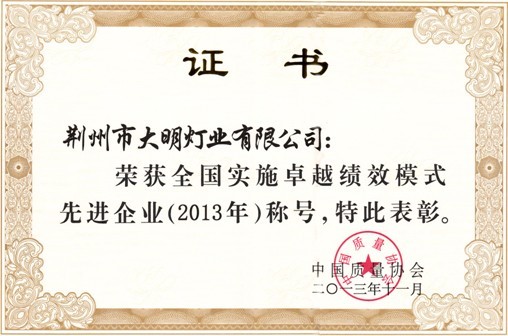 2013年11月3日,第十三屆全國(guó)追求卓越大會(huì)頒獎(jiǎng)典禮在北京京西賓館順利召開,荊州市大明燈業(yè)有限公司榮獲全國(guó)實(shí)施卓越績(jī)效模式先進(jìn)企業(yè)稱號(hào),成為荊州市此次唯一受到該項(xiàng)表彰的企業(yè)。 荊州市大明燈業(yè)有限公司是一家以生產(chǎn)各類照明產(chǎn)品的高新技術(shù)企業(yè)。自導(dǎo)入卓越績(jī)效模式以來,大明燈業(yè)一直致力于技術(shù)水平和管理水平的提升,通過學(xué)習(xí)和時(shí)間卓越績(jī)效模式,積極探索,開拓創(chuàng)新,經(jīng)過不懈努力,取得了顯著成效。此次獲得該榮譽(yù),代表著大明燈業(yè)的管理水平已經(jīng)達(dá)到了一個(gè)新的高度,極大地促進(jìn)了企業(yè)的經(jīng)營(yíng)質(zhì)量水平和綜合競(jìng)爭(zhēng)能力,樹立了全國(guó)實(shí)施卓越績(jī)效模式的先進(jìn)典型。 在此次表彰后企業(yè)會(huì)堅(jiān)持持續(xù)改進(jìn),努力超越自我,不斷提高產(chǎn)品、服務(wù)和經(jīng)營(yíng)質(zhì)量,增強(qiáng)核心競(jìng)爭(zhēng)力,繼續(xù)為提高我國(guó)的綜合國(guó)力做出貢獻(xiàn)。