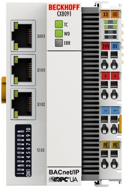 圖片注釋: CX8091 嵌入式控制器支持 BACnet 和 OPC UA 協(xié)議,非常適合用作一個(gè)小型本地控制器或者用作一個(gè)用于上位能源管理系統(tǒng)的數(shù)據(jù)采集器。