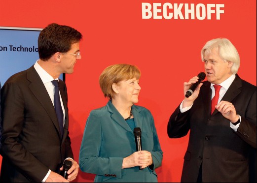 圖片注釋: 在2014 德國漢諾威工業(yè)博覽會上,Hans Beckhoff 先生熱情接待了德國總理安格拉•默克爾和荷蘭首相馬克•呂特,荷蘭是今年漢諾威工業(yè)博覽會的合作伙伴國。