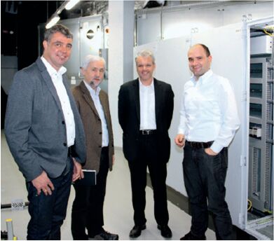 從左至右:Herrmann 公司的樓宇自動化團隊負責人 Michael Falkenstein,弗勞恩霍夫 IAO 的大樓管理人員 Heinz Kühner,來自Beckhoff德國巴林根辦事處的 Oliver Heilig和弗勞恩霍夫 IAO 的大樓主管站在 ZVE 地下室 HVAC 設備的控制柜前