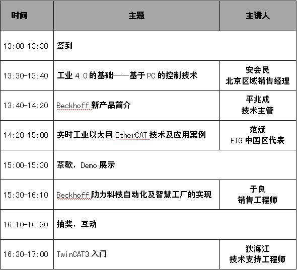 尊敬的 女士/先生: 信息技術(shù)和自動(dòng)化技術(shù)的融合是工業(yè)4.0的核心理論。Beckhoff基于PC的自動(dòng)化解決方案為用戶實(shí)現(xiàn)工業(yè)4.0提供了理想的控制架構(gòu)。為使北京地區(qū)用戶能夠更加深入了解到Beckhoff支持工業(yè)4.0的先進(jìn)技術(shù)和典型應(yīng)用,我們將于3月23日在北京遠(yuǎn)通維景大酒店舉行“基于PC的控制技術(shù)助力工業(yè)4.0——2016德國(guó)倍福北京技術(shù)交流會(huì)”。會(huì)上將分享Beckhoff的最新產(chǎn)品、實(shí)時(shí)工業(yè)以太網(wǎng)EtherCAT、科技自動(dòng)化與智慧工廠的實(shí)現(xiàn)、TwinCAT入門等內(nèi)容。歡迎廣大用戶報(bào)名參加。 我們誠(chéng)摯邀請(qǐng)您參加本次技術(shù)交流會(huì)。與您共同探討和分享基于工業(yè)4.0的Beckhoff自動(dòng)化解決方案。 請(qǐng)攜帶閣下名片參加,期待您的光臨!