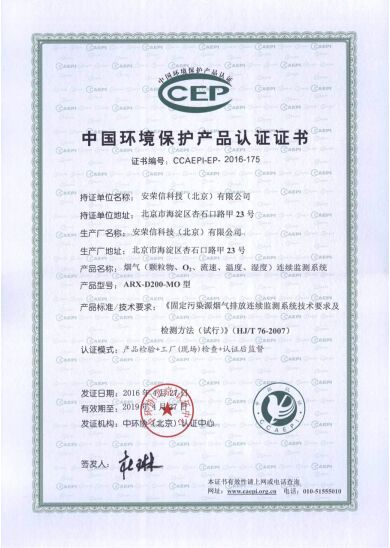 我公司自主研發(fā)生產(chǎn)的ARX-D200-MO煙氣顆粒物排放連續(xù)監(jiān)測系統(tǒng),順利通過環(huán)境保護(hù)部環(huán)境監(jiān)測儀器質(zhì)量監(jiān)督檢驗中心的復(fù)檢,取得合格檢測報告【編號:質(zhì)(認(rèn))字No.2016-069】,并取得中環(huán)協(xié)(北京)認(rèn)證中心頒發(fā)的CCEP中國環(huán)境保護(hù)產(chǎn)品認(rèn)證證書【編號:CCAEPI-EP-2016-175】 ARX-D200-MO型煙氣(顆粒物、O2、流速、溫度、濕度)排放連續(xù)監(jiān)測系統(tǒng),主要包含安榮信科技自主研發(fā)的抽取式煙塵儀LFS1000-MO、流速儀APT2000、氧分析儀及濕度儀。