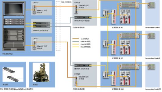 每個(gè)波蕩器單元共有 4 個(gè) AM3052 伺服電機(jī) —— 通過(guò) TwinCAT NC PTP 控制 — 確保磁鐵結(jié)構(gòu)精確定位。(圖片顯示的是上面磁鐵結(jié)構(gòu)的兩個(gè)電機(jī)) 大量波蕩器單元需要復(fù)雜的自動(dòng)化系統(tǒng) SASE 波蕩器段使用 19 寸抽拉式工業(yè) PC C5210 控制。它們通過(guò)具有電纜冗余的 EtherCAT 環(huán)形拓?fù)浣Y(jié)構(gòu)聯(lián)網(wǎng)。由于隧道長(zhǎng)達(dá)數(shù)公里,因此必須使用光纖電纜。此外,每個(gè) SASE 段中的波蕩器單元通過(guò)菊花鏈形式的以太網(wǎng)互相鏈接。在每個(gè)波蕩器單元中,控制柜式 PC C6925 通過(guò) TwinCAT NC PTP 控制用于4 個(gè) AM3052 伺服電機(jī)的 2 個(gè) AX5206 伺服驅(qū)動(dòng)器。工業(yè) PC 還控制三個(gè)步進(jìn)電機(jī) — 兩個(gè)用于四極動(dòng)子,一個(gè)用于移相器。移相器電機(jī)與伺服驅(qū)動(dòng)器同步運(yùn)行,并校正各個(gè)波蕩器單元之間電子和光子束的相位。針對(duì)所需的 I/O 數(shù)據(jù),每個(gè)波蕩器單元提供 35 個(gè) EtherCAT 端子模塊,模擬量和數(shù)字量 I/O、以及脈沖、編碼器和橋接端子模塊。總體來(lái)說(shuō),基于 PC 的控制解決方案由三臺(tái) 19 英寸抽拉式工業(yè) PC C5210、91 臺(tái)控制柜式 PC C6925、182 個(gè) AX5206 伺服驅(qū)動(dòng)器、364 個(gè) AM3052 伺服電機(jī)以及約 3200 個(gè) EtherCAT 端子模塊構(gòu)成。
