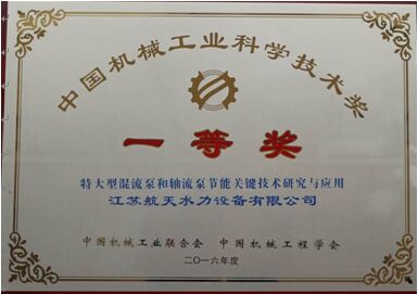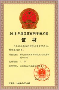 從江蘇省科技廳獲悉,江蘇航天水力設(shè)備有限公司申報(bào)的2016年江蘇省科學(xué)技術(shù)獎(jiǎng)項(xiàng)目“特大型混流泵和軸流泵及裝置研制與應(yīng)用”榮獲江蘇省科學(xué)技術(shù)獎(jiǎng)三等獎(jiǎng)。