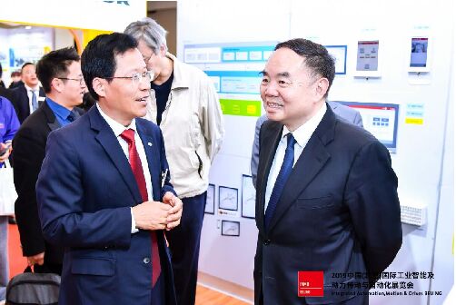 倍福中國區(qū)執(zhí)行董事、總經(jīng)理梁力強(左)陪同中國工程院院士、中國機械工程學會榮譽理事長周濟(中)參觀倍福展臺