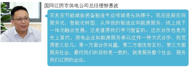 雙良節(jié)能繆文彬董事長(zhǎng) 與國(guó)網(wǎng)江陰市供電公司總經(jīng)理柳惠波簽約 合作內(nèi)容 凝聚雙方優(yōu)勢(shì),推動(dòng)社會(huì)能效提升 信息技術(shù)共享,共建能源互聯(lián)網(wǎng)平臺(tái) 推動(dòng)產(chǎn)業(yè)聯(lián)盟,構(gòu)建能源服務(wù)新業(yè)態(tài) 加強(qiáng)優(yōu)勢(shì)互補(bǔ),培育科研技術(shù)成果