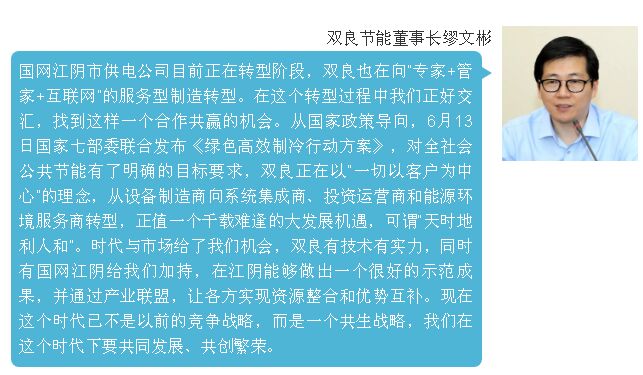 雙方合作旨在共同建設(shè)以能源高效互聯(lián)、用戶友好交互(涵蓋政府機(jī)構(gòu)、能源服務(wù)商、企業(yè)和電網(wǎng))的江陰能源互聯(lián)網(wǎng)云平臺(tái)。依托能源互聯(lián)網(wǎng)平臺(tái),雙良節(jié)能將優(yōu)化的節(jié)能設(shè)計(jì)方案和自身核心技術(shù)集成與國(guó)網(wǎng)江陰市供電公司及下屬企業(yè)參與的節(jié)能系統(tǒng)規(guī)劃設(shè)計(jì)、設(shè)備集成及系統(tǒng)建設(shè)進(jìn)行融合。 基于各自的技術(shù)優(yōu)勢(shì)與資源優(yōu)勢(shì),雙方將在江陰市內(nèi),就新建及改造的工商業(yè)公共事業(yè)項(xiàng)目中暖通節(jié)能減排等綜合能源服務(wù)領(lǐng)域開展長(zhǎng)期的、全面的戰(zhàn)略合作,并建立密切的合作伙伴關(guān)系,打造共贏、可持續(xù)發(fā)展的戰(zhàn)略合作伙伴關(guān)系,共同建立和推行建筑暖通領(lǐng)域里的節(jié)能運(yùn)營(yíng)托管(OC)、合同能源管理(EMC)、暖通配套工程總承包(EPC)和工程總承包+運(yùn)營(yíng)托管(EPC+C)等多方位節(jié)能領(lǐng)域的合作機(jī)制與商業(yè)模式的創(chuàng)新。