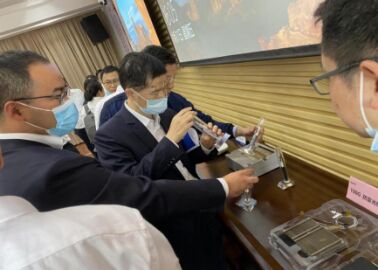 ∆現(xiàn)場領(lǐng)導(dǎo)及專家觀看烽火展示設(shè)備