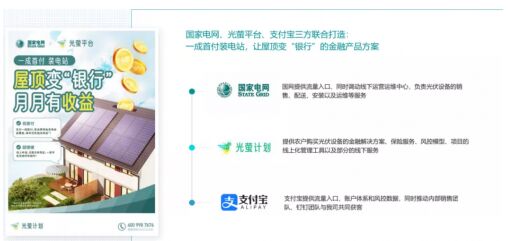 “光螢計劃”(即“光寶寶”)是光螢平臺(由網(wǎng)金中心運營管理的平臺)在“碳中和”背景下,攜手國家電網(wǎng)、支付寶,以及中國投融資擔(dān)保股份有限公司、國投泰康信托有限公司等多家金融機構(gòu)共同打造的一款針對戶用光伏電站綜合性融資服務(wù)的產(chǎn)品,以戶用光伏電站為支點,通過“光伏+普惠金融+數(shù)字科技”的方式,用綠色金融和普惠金融推動鄉(xiāng)村振興建設(shè)。