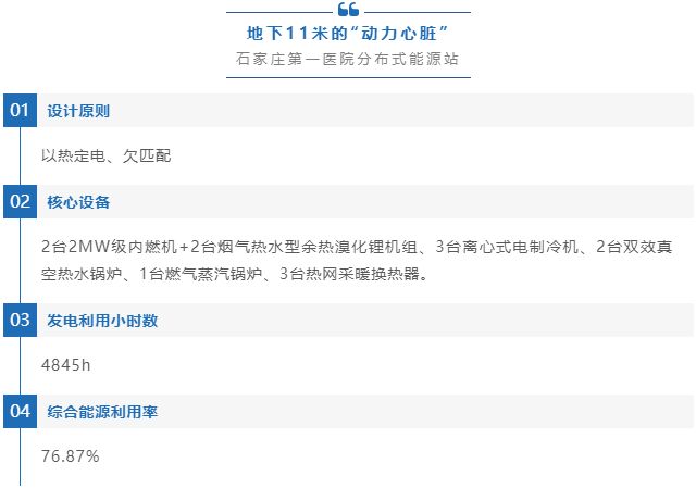 河北華電石家莊第一醫(yī)院(現(xiàn)稱石家莊市人民醫(yī)院)燃?xì)夥植际侥茉错?xiàng)目采用以天然氣為基礎(chǔ)能源的先進(jìn)的第三代冷、熱、電三聯(lián)供技術(shù),為醫(yī)院提供制冷、采暖、供電、生活熱水以及醫(yī)用蒸汽綜合能源服務(wù),是國內(nèi)首批“自發(fā)自用、并網(wǎng)不上網(wǎng)”的天然氣分布式能源項(xiàng)目,機(jī)組配置優(yōu)化,兩個(gè)“欠匹配”,回歸分布式本質(zhì)功能屬性,引領(lǐng)示范效應(yīng)顯著。項(xiàng)目由華電分布式能源工程技術(shù)有限公司承建,建成后由石家莊華電供熱集團(tuán)有限公司負(fù)責(zé)運(yùn)營。 該項(xiàng)目的建設(shè)是落實(shí)國家節(jié)能政策,建設(shè)節(jié)約型社會(huì),實(shí)現(xiàn)可持續(xù)發(fā)展戰(zhàn)略的需要,功能是為石家莊第一醫(yī)院項(xiàng)目提供冷、熱、電、蒸汽綜合能源服務(wù),滿足醫(yī)院對(duì)能源的實(shí)際需求;夏季冷熱電聯(lián)供運(yùn)行時(shí),發(fā)電機(jī)組的高溫冷卻水可根據(jù)用能需求用于制冷或供熱,運(yùn)行控制先進(jìn)適應(yīng)性強(qiáng);低溫?zé)煔庥糜谥迫∩顭崴,排煙溫度低,能源綜合利用率高,該項(xiàng)目引入市政熱網(wǎng)作為采暖季熱源之一。 該項(xiàng)目建成后,與同容量常規(guī)燃煤熱電廠相比,年節(jié)約標(biāo)煤2974.35t/a,節(jié)能率為27%;年CO₂減排12156.18t/a,減排率為48%,具有較好的經(jīng)濟(jì)和環(huán)境效益。設(shè)備滿足節(jié)能減排,提高經(jīng)濟(jì)效率的需要,對(duì)區(qū)域環(huán)境改善作用巨大。