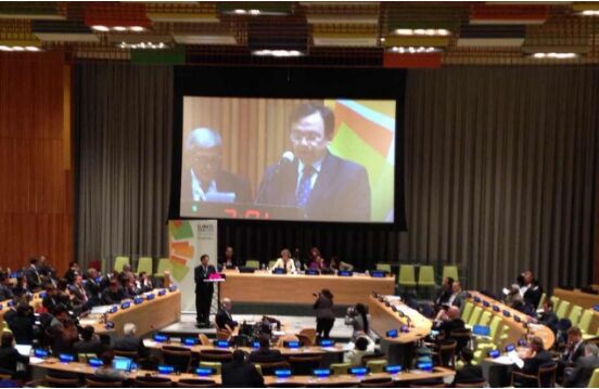 當?shù)貢r間2014年9月23日,巴黎氣候變化大會前最為重要的大會——2014年聯(lián)合國氣候峰會在紐約聯(lián)合國總部隆重舉行,來自全球120多個國家的元首和政府首腦齊聚一堂,共同商討全球氣候變化問題。應(yīng)時任聯(lián)合國秘書長潘基文邀請,比亞迪股份有限公司董事長兼總裁王傳福作為全球唯一被邀請的汽車企業(yè)代表,出席峰會并發(fā)表演講。王傳福指出,城市公交電動化是快速提升城市空氣質(zhì)量的最佳途徑,全球?qū)⒂瓉沓鞘泄浑妱踊慕煌ǜ锩。會上,王傳福呼吁各國將電動汽車引入到更廣泛的城市交通領(lǐng)域,并預(yù)測:不久的將來,光伏發(fā)電及新能源汽車將會成為世界各國的重中之重。