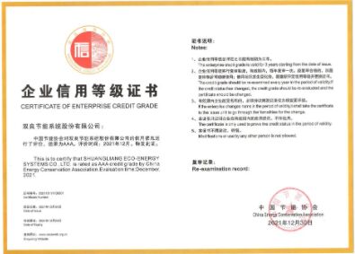 為增強企業(yè)創(chuàng)新力和競爭力,切實推動節(jié)能減排工作,促進經(jīng)濟綠色發(fā)展,切實提高企業(yè)誠信意識,提升企業(yè)信用管理能力,夯實中國節(jié)能協(xié)會行業(yè)誠信體系建設(shè),2021年,中國節(jié)能協(xié)會本著公開、公平、公正、科學(xué)的原則,依據(jù)《節(jié)能行業(yè)企業(yè)信用等級評價管理辦法》,通過企業(yè)自愿申報,經(jīng)初評,并經(jīng)協(xié)會信評辦、信用評價專家委員會審核后評定雙良節(jié)能為AAA級企業(yè)。