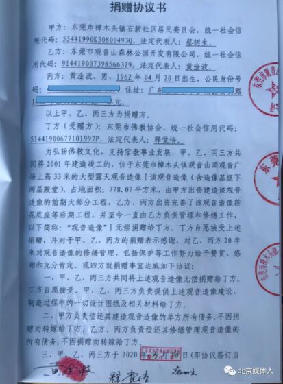 觀音像在2001年開完光以后,黃淦波就寫了一個捐贈書給東莞市民宗局,大概內(nèi)容是說觀音像建好了,開完光了,觀音寺也得到批復(fù)可以重建。觀音山公園主動把這些財產(chǎn)捐給東莞市佛j協(xié)會,特此為證,簽了名蓋了章送到東莞市民宗局——可惜此文件據(jù)說已找不到。2007年,胡某棋又勒令黃淦波簽署一份類似的捐贈協(xié)議,此協(xié)議有文本仍在,可查,但胡某棋說不承認有此事。