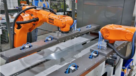 兩個庫卡關(guān)節(jié)型機器人與倍福基于 PC 的控制技術(shù)進行相結(jié)合,堆放剪切好的疊片。