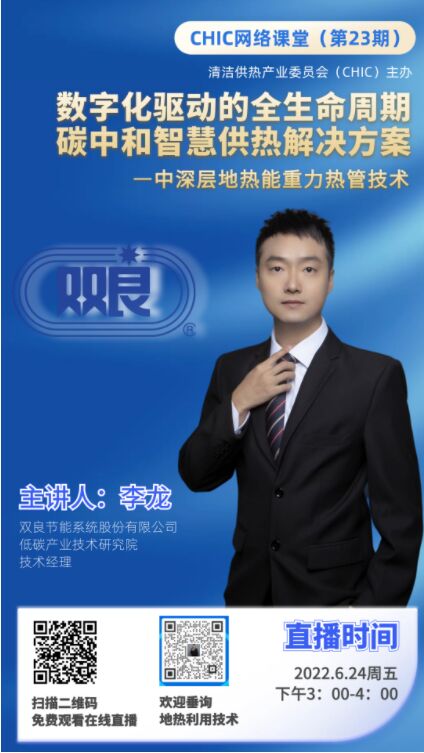 2022年6月24日(周五下午)三點(diǎn),由清潔供熱產(chǎn)業(yè)委員會(huì)(CHIC)主辦的“CHIC網(wǎng)絡(luò)課堂”將邀請(qǐng)到雙良節(jié)能系統(tǒng)股份有限公司低碳產(chǎn)業(yè)技術(shù)研究院技術(shù)經(jīng)理李龍為大家分享《數(shù)字化驅(qū)動(dòng)的全生命周期碳中和智慧供熱解決方案—中深層地?zé)崮苤亓峁芗夹g(shù)》主題講座。