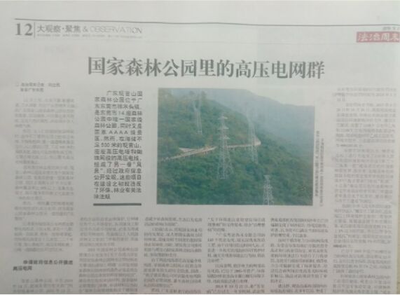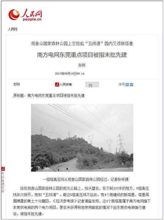 追溯起來,可以說早在2002年,廣東電網(wǎng)公司東莞市供電局就在未經(jīng)公園同意,也未向公園方提供國家林業(yè)、國土資源等部門關(guān)于同意在公園內(nèi)架設(shè)高壓線塔的批復(fù)文件夾,就擅自違法將多組高壓線塔強(qiáng)行架設(shè)在觀音山國家級(jí)森林公園內(nèi)。