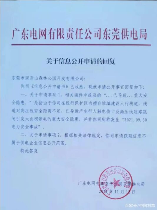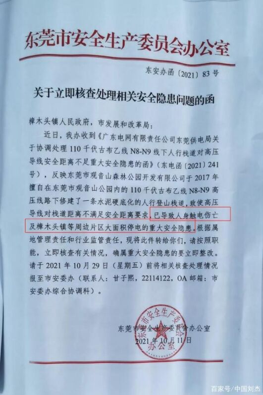 本應(yīng)是一起簡單的對(duì)山體塔方形成的傾斜電塔的塔基進(jìn)行維護(hù)加固的公事,應(yīng)該是供電部門的工作義務(wù)。結(jié)果,供電部門不僅直接拒收觀音山方的信函,反而于10月11日向樟木頭人民政府發(fā)函稱:觀音山公園不自行維護(hù),在我局主動(dòng)要求維護(hù)的情況下,還阻擾我局對(duì)影響桿塔安全的邊坡進(jìn)行維修。并稱“觀音山森林公園在線行保護(hù)區(qū)內(nèi)擅自堆填建設(shè)人行棧道,并將其開放供人員活動(dòng)的行為,已導(dǎo)致人身觸電傷亡及樟木頭鎮(zhèn)等周邊片區(qū)大面積停電的重大安全隱患!