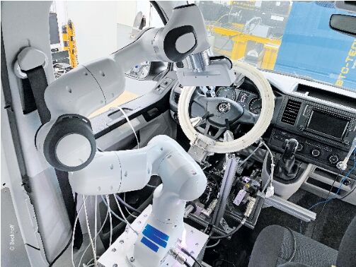在試驗(yàn)期間,車輛會(huì)在真實(shí)的路面駕駛條件下進(jìn)行模擬。駕駛試驗(yàn)臺(tái)會(huì)根據(jù)仿真轉(zhuǎn)矩轉(zhuǎn)動(dòng)車輪,甚至可以模擬車輪轉(zhuǎn)向運(yùn)動(dòng)。這種仿真試驗(yàn)真實(shí)度極高,可以使用相應(yīng)的執(zhí)行機(jī)構(gòu)仿真駕駛員的動(dòng)作。大部分動(dòng)作由工業(yè)機(jī)器人執(zhí)行,以完成盡可能多的不同動(dòng)作。試驗(yàn)臺(tái)還可以模擬現(xiàn)實(shí)環(huán)境,以及車輛如何與周圍環(huán)境進(jìn)行通信(例如通過 GPS 系統(tǒng))?掀针鴳(yīng)用技術(shù)大學(xué)除了成功開發(fā)試驗(yàn)臺(tái)之外,還為系統(tǒng)打造了一個(gè)數(shù)字孿生平臺(tái)。這不僅有利于實(shí)現(xiàn)試驗(yàn)臺(tái)的預(yù)試車,而且還能夠?qū)崿F(xiàn)全面的系統(tǒng)可視化和監(jiān)測。