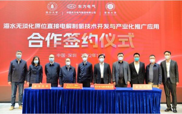 2022年12月16日,東方電氣股份有限公司、東方電氣(福建)創(chuàng)新研究院有限公司與四川大學(xué)/深圳大學(xué)謝和平院士團(tuán)隊(duì)在深圳簽署“海水無淡化原位直接電解制氫原創(chuàng)技術(shù)中試和產(chǎn)業(yè)化推廣應(yīng)用”的四方合作協(xié)議。中國(guó)工程院院士謝和平,東方電氣集團(tuán)黨組成員、副總經(jīng)理張彥軍,深圳大學(xué)副校長(zhǎng)汪永成等出席簽約儀式。