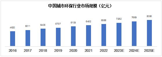 自2020年起,我國環(huán)保行業(yè)的營業(yè)收入占 GDP的比例便已達到并維持在2%左右。根據(jù)市場調研在線網發(fā)布的分析報告顯示,2016年中國城市環(huán)保行業(yè)市場規(guī)模為4620億元,2022年已達6866億元,并將在 2025年達到8086億元。
