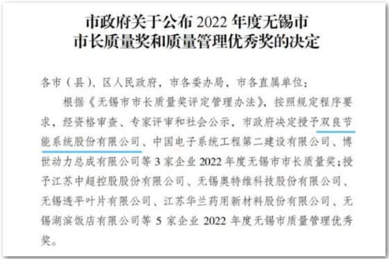 無錫市市長質(zhì)量獎(jiǎng)是無錫市人民政府設(shè)立的最高質(zhì)量榮譽(yù)獎(jiǎng),包括“無錫市市長質(zhì)量獎(jiǎng)”和“無錫市質(zhì)量管理優(yōu)秀獎(jiǎng)”兩個(gè)獎(jiǎng)項(xiàng),表彰無錫市在經(jīng)營管理和質(zhì)量管理方面取得卓越績效的組織,引導(dǎo)和激勵(lì)廣大組織建立和實(shí)施先進(jìn)的質(zhì)量管理模式,踐行高質(zhì)量發(fā)展理念。該獎(jiǎng)項(xiàng)的獲得,既是對雙良節(jié)能持續(xù)踐行綠色發(fā)展、高質(zhì)量發(fā)展的肯定,也是對雙良節(jié)能始終如一專注品質(zhì)和服務(wù)的重要認(rèn)可。