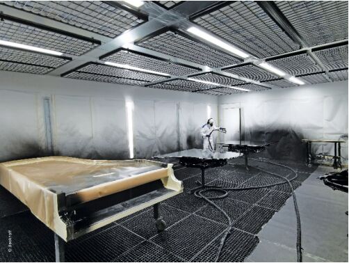早在 30 年前就與貝森朵夫有過合作的 Berkmann Lackieranlagen 公司再次接受委托,建造新的車間。“但新噴漆車間的工藝流程基于全新的設(shè)計(jì)方案!变N售&技術(shù)總監(jiān) Rainer Berkmann 解釋道。內(nèi)部裝有通風(fēng)裝置、過濾系統(tǒng)以及熱回收和發(fā)電系統(tǒng)的設(shè)備控制中心,與工廠廠房分開安置在一棟建筑物內(nèi)。這樣就可以在噴漆作業(yè)區(qū)設(shè)立寬敞的工位,以及準(zhǔn)備工位和烘干室。油漆存放和準(zhǔn)備區(qū)也被整合到車間整體設(shè)計(jì)方案中。