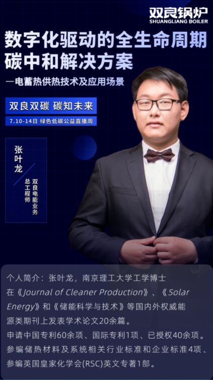 7月11日,雙良鍋爐電能業(yè)務(wù)部總工程師張葉龍博士,被特邀作了題為“數(shù)字化驅(qū)動(dòng)下的全生命周期碳中和解決方案-電蓄熱供熱技術(shù)及應(yīng)用場(chǎng)景”的演講。