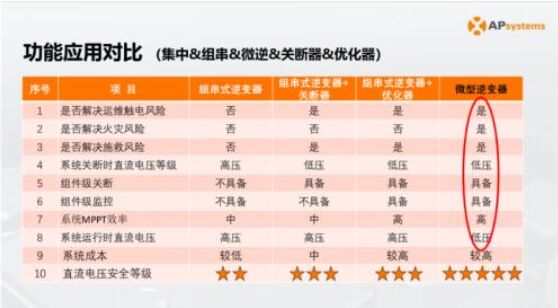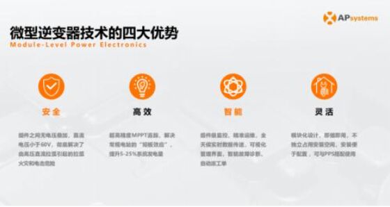 伴隨分布式光伏的加速滲透,安全、智能、靈活逐漸成為光伏逆變器重要的衡量標(biāo)準(zhǔn),以微型逆變器為代表的MLPE的技術(shù)優(yōu)勢也日益凸顯。對此,周總綜合對比組串式逆變器、微型逆變器、關(guān)斷器和優(yōu)化器的技術(shù)特點(diǎn),指出:微型逆變器技術(shù)路線具有安全、高效、智能、靈活四大優(yōu)勢。