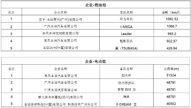 在兩天的比賽中,共有來自全國各大高校、Honda 關(guān)聯(lián)企業(yè)的近 60 支車隊,在燃油車和電動車的兩個級別四個組別中進(jìn)行了激烈角逐。最終燃油車級別的桂冠由吉林大學(xué)肯賽節(jié)能車隊和五羊-本田摩托(廣州)有限公司陽光車隊,電動車級別桂冠由北京理工大學(xué)翼昇 2 隊和東風(fēng)本田汽車有限公司創(chuàng)未來車隊斬獲。