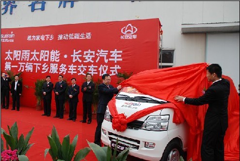 3月22日,太陽雨攜長(zhǎng)安汽車第10000輛下鄉(xiāng)服務(wù)車交車儀式,在太陽雨集團(tuán)連云港寧;貙(shí)現(xiàn)成功交接,太陽雨集團(tuán)董事長(zhǎng)徐新建、重慶長(zhǎng)安汽車股份有限公司副總裁宋嘉共同為第10000輛太陽雨紅太陽服務(wù)車揭下紅綢;隨后,太陽雨集團(tuán)董事長(zhǎng)徐新建親手將車鑰匙交付給前來取車的太陽雨河南商丘經(jīng)銷商張冠海,至此,短短一年多時(shí)間,太陽雨太陽能第10000輛下鄉(xiāng)服務(wù)車已全部順利交付,大大超過了預(yù)期。 延續(xù)太陽雨集團(tuán)連續(xù)兩年斬獲家電下鄉(xiāng)中標(biāo)產(chǎn)品最多,中標(biāo)區(qū)域最廣;以及行業(yè)首家百萬臺(tái)下線的輝煌;太陽雨集團(tuán)在09年家電下鄉(xiāng)銷售中取得優(yōu)異成績(jī),太陽雨單品牌實(shí)現(xiàn)年度87.78%的銷量增長(zhǎng),截止目前,已排名太陽能熱水器家電下鄉(xiāng)系統(tǒng)銷量、銷售額第一。銷售的增長(zhǎng)直接拉動(dòng)售后服務(wù)提速,10000輛太陽雨售后服務(wù)車由三年交車提前至一年完成,再次驗(yàn)證了國家家電下鄉(xiāng)政策對(duì)家電下鄉(xiāng)企業(yè)的銷售起到了強(qiáng)力的助推作用,也為中國農(nóng)村的城市化進(jìn)程提供了市場(chǎng)及服務(wù)保證。 作為太陽能家電下鄉(xiāng)大省,河南市場(chǎng)在09年獲得井噴,前來公司總部取車的太陽雨河南商丘永城市場(chǎng)經(jīng)銷商張冠海,僅去年一年,他所經(jīng)營的永陽市場(chǎng)即實(shí)現(xiàn)了100%的增長(zhǎng)。銷量的增長(zhǎng)帶來的直接困擾就是售后服務(wù)的壓力,張冠海興奮地說到:“有了紅太陽售后服務(wù)車,不僅每天可以完成更多的安裝任務(wù),客戶一個(gè)電話,也能第一時(shí)間趕到現(xiàn)場(chǎng)了! 同樣受益于下鄉(xiāng)潮流的長(zhǎng)安汽車,09年微車銷量達(dá)67.52萬輛,增長(zhǎng)87%,利潤巨大,大幅推動(dòng)公司業(yè)績(jī)?cè)鲩L(zhǎng)。長(zhǎng)安汽車在和太陽雨集團(tuán)的合作中嘗到了甜頭,公司也趁這個(gè)機(jī)會(huì)成立了“大客戶服務(wù)部”,用這種針對(duì)性模式來服務(wù)太陽雨這樣的大客戶。重慶長(zhǎng)安汽車股份有限公司副總裁宋嘉談到與太陽雨集團(tuán)的合作時(shí)說到:“家電下鄉(xiāng)和城鎮(zhèn)化建設(shè),讓我們與太陽雨這種深耕鄉(xiāng)鎮(zhèn)、農(nóng)村市場(chǎng)的企業(yè),找到了業(yè)務(wù)的共同點(diǎn),探討并建立了一種全新的合作模式! 而操作過若干次跨行業(yè)合作模式的太陽雨集團(tuán)掌舵者徐新建,對(duì)此頗有心得:“除了簽約長(zhǎng)安,我們此前曾攜手聯(lián)想,為經(jīng)銷商購置萬臺(tái)電腦,為經(jīng)銷商網(wǎng)點(diǎn)備案提供‘硬件’;在‘軟件’上,我們與中國平安合作,為經(jīng)銷商及其安裝工團(tuán)隊(duì)購買了總保額達(dá)10億元的團(tuán)體險(xiǎn)!