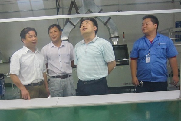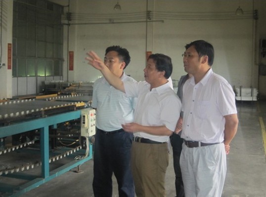 圖為松滋市發(fā)改局局長羅明雄(右二)、副局長張磊(左二)、李主任在營銷總監(jiān)文純陽的陪同下參觀大明燈業(yè)生產基地。