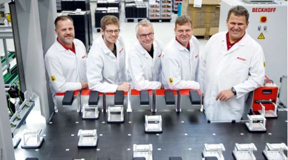 如此精密的系統(tǒng)只能由一個完整的團隊進行設(shè)計和實施才能完成(倍福專家團隊,左起):Daniel Golz(機械設(shè)計)、Mathis Blattner(測試柜軟件開發(fā))、Ulrich Brockhaus(系統(tǒng)編程)、Stefan Engelke(測試設(shè)備開發(fā))和 Michael Golz(演示系統(tǒng)部門主管)