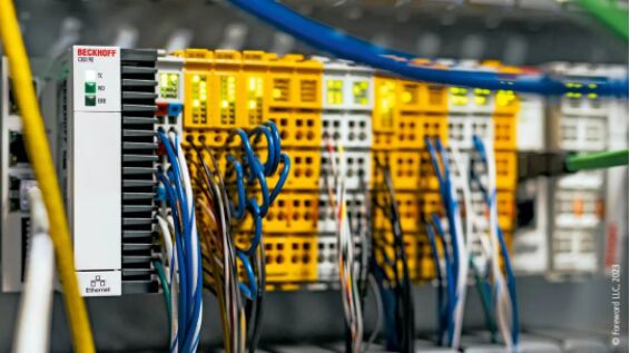 Stretch™ 的安全系統(tǒng)配備的是 EtherCAT I/O 端子模塊和黃色 TwinSAFE 安全模塊,機(jī)器人和遠(yuǎn)程控制柜中都安裝了這些模塊