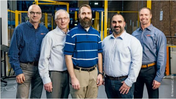 自動(dòng)化技術(shù)和機(jī)器人專家們?cè)诓ㄊ款D動(dòng)力公司的測(cè)試中心:(左起)倍福內(nèi)部物流行業(yè)應(yīng)用專家 Gilbert Petersen;倍福區(qū)域銷售經(jīng)理 Brian Buck;波士頓動(dòng)力公司 Stretch 硬件技術(shù)總監(jiān) Matthew Meduna;波士頓動(dòng)力公司供應(yīng)鏈總監(jiān) Eric Landry;以及倍福全球物料搬運(yùn)和內(nèi)部物流行業(yè)經(jīng)理 Doug Schuchart