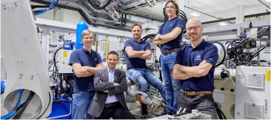 向器生產(chǎn)設(shè)計(jì)和自動(dòng)化試驗(yàn)臺(tái):聲學(xué)專家 Julius Ellmann、電氣工程師 Michael Sauerwein 和軟件專家 Karsten Mauersberger。在兩者之間(左二):瑞士倍福分公司銷售工程師 Maurus Kaelin