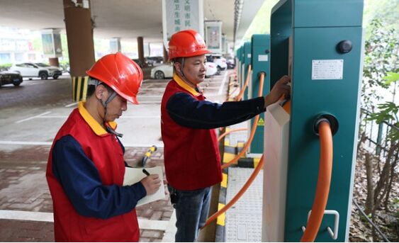 (國網(wǎng)邵陽供電公司共產黨員服務隊在步步高商場充電站進行日常維護作業(yè)。圖片由 星辰全媒體記者 賀亞玲 攝)