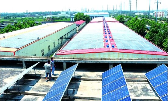 7月14日,三門峽產(chǎn)業(yè)集聚區(qū)光伏發(fā)電項(xiàng)目員工在一家企業(yè)屋頂巡檢太陽能板。該項(xiàng)目是三門峽首個(gè)光伏發(fā)電項(xiàng)目,2013年6月投產(chǎn),裝機(jī)容量逐步增加到19.5兆瓦。項(xiàng)目利用園區(qū)10余家工廠廠房屋頂覆設(shè)的太陽能板,發(fā)電除滿足企業(yè)自用外,大部分電量銷售給國家電網(wǎng)三門峽供電公司。