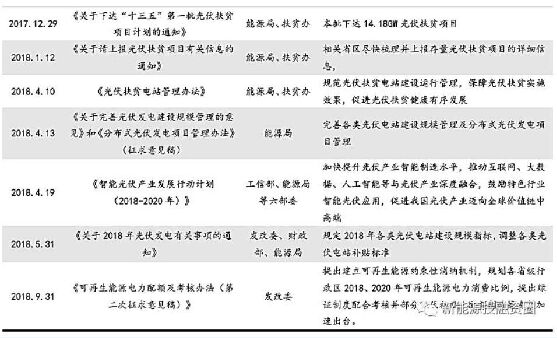 光伏制造各環(huán)節(jié)成本持續(xù)下降,平價上網(wǎng)即將來臨。2018H1,硅料、硅片、電池片、組件環(huán)節(jié)的制造成本(含稅)已降至65.00 元/kg、3.45 元/片、1.31 元/W、2.27 元/W,系統(tǒng)成本約5.4 元/W。補貼退坡倒逼光伏制造企業(yè)通過產(chǎn)能擴張和技術(shù)進步不斷降低生產(chǎn)成本,平價上網(wǎng)即將來臨。平價上網(wǎng)假設(shè)下,光伏各環(huán)節(jié)成本將進一步下降,硅料、硅片、電池片、組件環(huán)節(jié)的制造成本(含稅)分別約為45.00元/kg、2.10元/片、0.77 元/W、1.56元/W,系統(tǒng)成本約3.29元/W。 531 政策短期沖擊明顯,有利于推動平價上網(wǎng)。2018年5月31日,三部委聯(lián)合發(fā)布《關(guān)于2018年光伏發(fā)電有關(guān)事項的通知》,政策影響主要體現(xiàn)在以下兩個方面:從短期來看,指標(biāo)限制導(dǎo)致我國2018 年光伏裝機需求下滑。根據(jù)政策安排,2018年暫不安排通光伏電站指標(biāo),安排10GW左右規(guī)模用于分布式光伏項目。從中長期來看,光伏補貼退有望推動平價上網(wǎng)加速實現(xiàn)。政策規(guī)定,自發(fā)文之日起,新投運的光伏電站標(biāo)桿上網(wǎng)電價每千瓦時統(tǒng)一降低0.05元;新投運的、采用“自發(fā)自用、余電上網(wǎng)”模式的分布式光伏發(fā)電項目,全電量度電補貼標(biāo)準降低0.05元。光伏補貼退坡能夠推動企業(yè)通過技術(shù)進步降低成本,光伏平價上網(wǎng)即將到來。 配額制即將落地,或?qū)⒅ζ絻r上網(wǎng)加速。2018年9月,發(fā)改委下發(fā)《可再生能源電力配額及考核辦法(第二次征求意見稿)》,提出建立可再生能源約束性消納機制,規(guī)劃各省級行政區(qū)2018、2020年可再生能源電力消費比例,對保障小時數(shù)以內(nèi)的集中式風(fēng)電、光伏電量以及其他非水可再生能源發(fā)電量施行全額保障性收購(考慮技術(shù)等限制因素最多限電5%)。配額制若能落地,必將提高光伏電站年利用小時數(shù),進一步降低度電成本,助力平價上網(wǎng)加速。近期光伏政策一覽表如下: